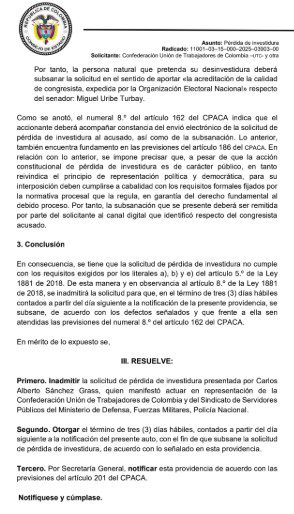 El magistrado ponente, Luis Alberto Álvarez Parra, otorgó un plazo de tres días hábiles al solicitante para subsanar las falencias detectadas y precisar si actúa como ciudadano en nombre propio, adjuntando los documentos exigidos y remitiendo la solicitud correctamente al senador Miguel Uribe Turbay.