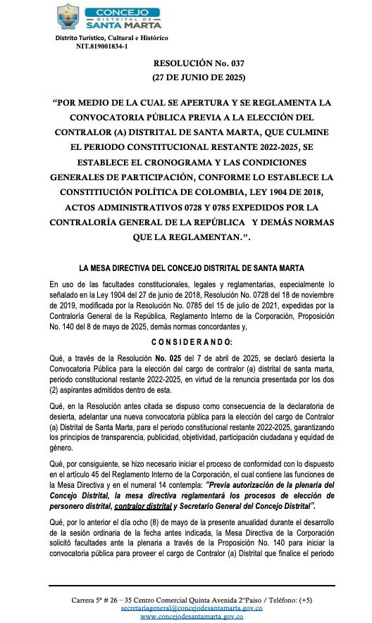 Mediante la Resolución No. 037 del 27 de junio de 2025, el Concejo Distrital de Santa Marta abrió oficialmente la convocatoria pública para proveer el cargo de Contralor (a) Distrital, quien deberá completar el periodo constitucional restante 2022-2025. Esta nueva convocatoria se da luego de que se declarara desierto el proceso anterior por la renuncia de los aspirantes admitidos.