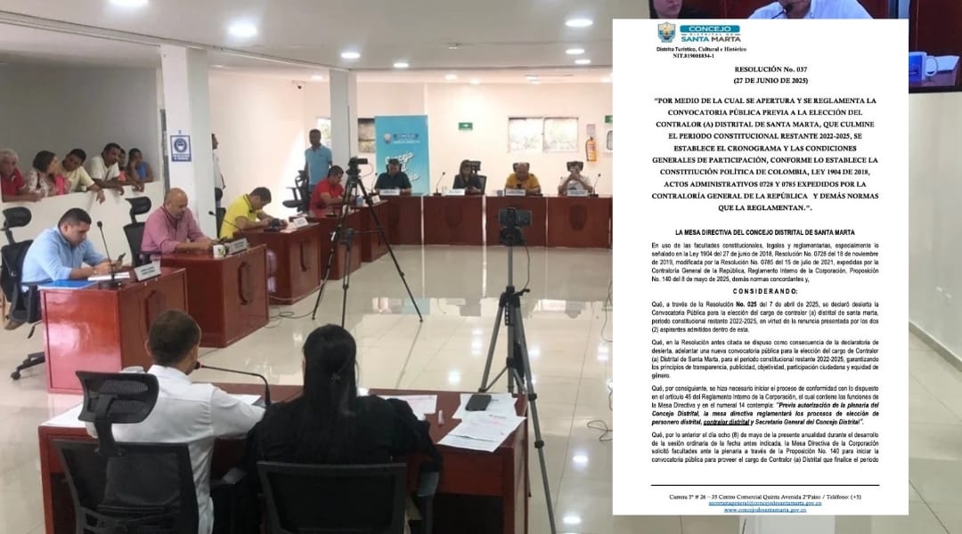 Mediante la Resolución No. 037 del 27 de junio de 2025, el Concejo Distrital de Santa Marta abrió oficialmente la convocatoria pública para proveer el cargo de Contralor (a) Distrital, quien deberá completar el periodo constitucional restante 2022-2025. Esta nueva convocatoria se da luego de que se declarara desierto el proceso anterior por la renuncia de los aspirantes admitidos.
