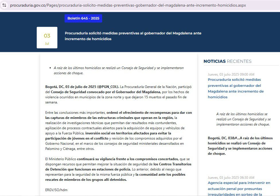 Ante el alarmante incremento de la violencia en el departamento del Magdalena, la Procuraduría General de la Nación solicitó al gobernador Rafael Martínez implementar medidas preventivas inmediatas para contener la escalada criminal que azota la región. Según el más reciente informe de la Plataforma de Derechos Humanos de la Sierra Nevada (PDHAL), entre enero y junio de 2025 se han registrado 340 homicidios, convirtiendo este semestre más violento de los últimos años.