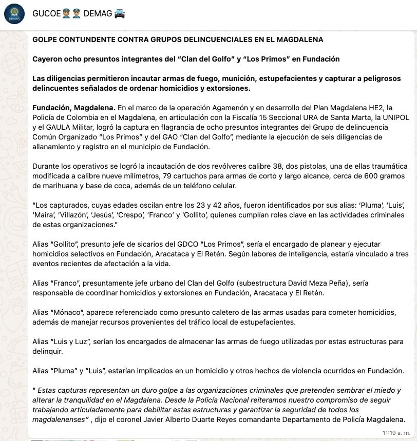 Según la Policía, alias ‘Gollito’ sería el presunto jefe de sicarios del GDCO ‘Los Primos’ y estaría vinculado a al menos tres homicidios selectivos ocurridos recientemente en los municipios de Fundación, Aracataca y El Retén. Además, la institución señaló que alias ‘Franco’ habría actuado como jefe urbano del Clan del Golfo, subestructura ‘David Meza Peña’, coordinando extorsiones y asesinatos en las mismas localidades.