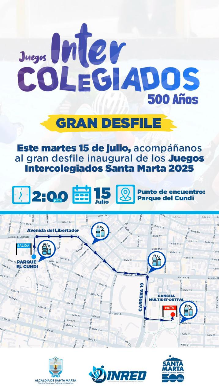 Con un gran desfile que partirá desde el Parque de El Cundí y recorrerá la Avenida del Libertador hasta llegar a la cancha multideportiva, Santa Marta le da la bienvenida este martes 15 de julio a los Juegos Intercolegiados 2025; con participación de más de 6.400 estudiantes de todo el distrito.