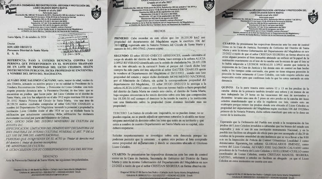 De acuerdo con los documentos radicados por el presidente de la veeduría, Álvaro José Salomón Calvano, se denuncia que los terrenos del Liceo adquiridos en 1912 por el entonces gobernador Gauter Charles y registrados en la escritura pública 106 del 20 de noviembre de ese mismo año habrían sido traspasados irregularmente por el exalcalde Hugo Gnecco a particulares, a pesar de tratarse de bienes de uso público propiedad del Departamento del Magdalena.