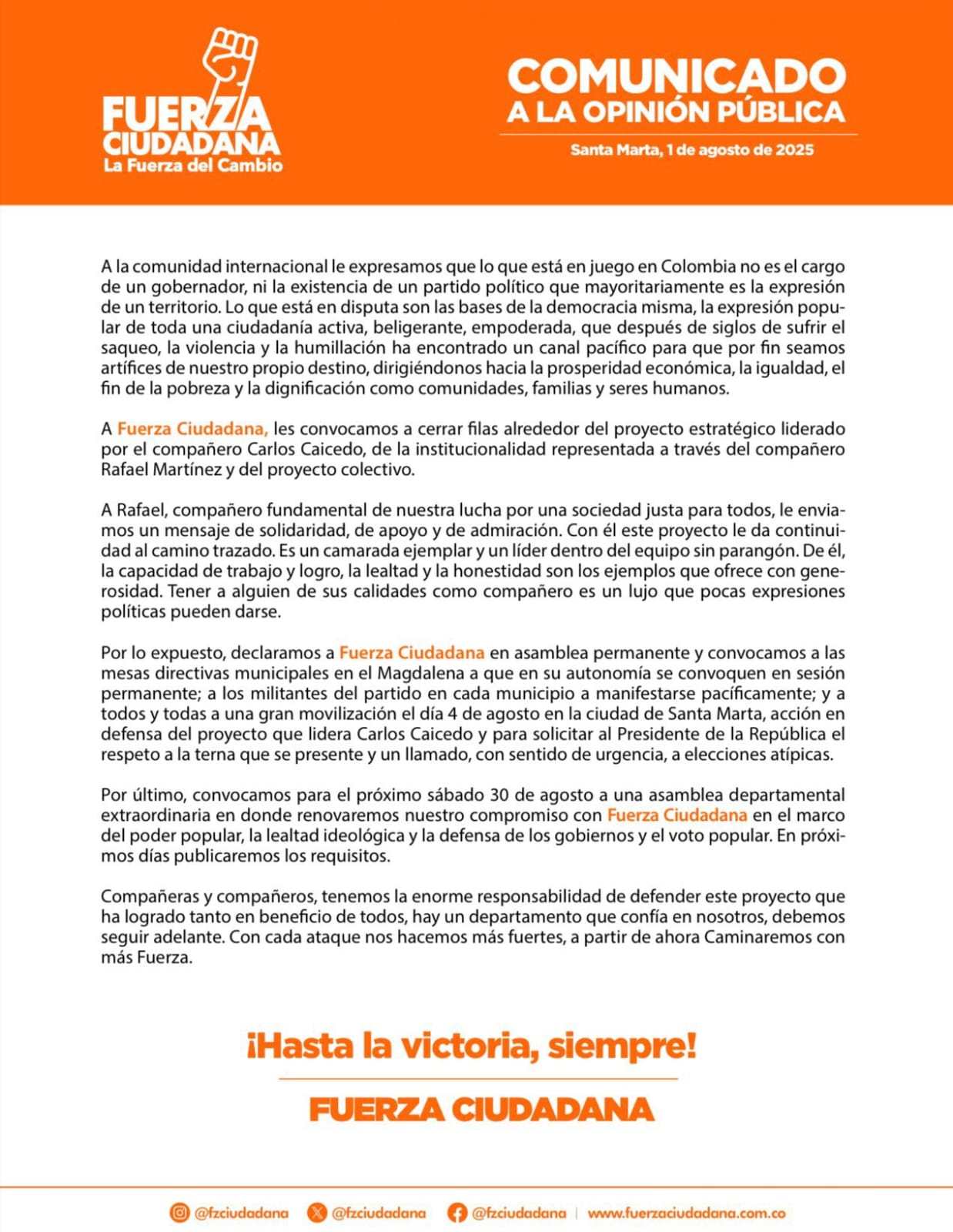 Por lo expuesto, declaramos a Fuerza Ciudadana en asamblea permanente y convocamos a las mesas directivas municipales en el Magdalena a que en su autonomía se convoquen en sesión permanente; a los militantes del partido en cada municipio a manifestarse pacíficamente; y a todos y todas a una gran movilización el día 4 de agosto en la ciudad de Santa Marta, acción en defensa del proyecto que lidera Carlos Caicedo y para solicitar al Presidente de la República el respeto a la terna que se presente y un llamado, con sentido de urgencia, a elecciones atípicas.