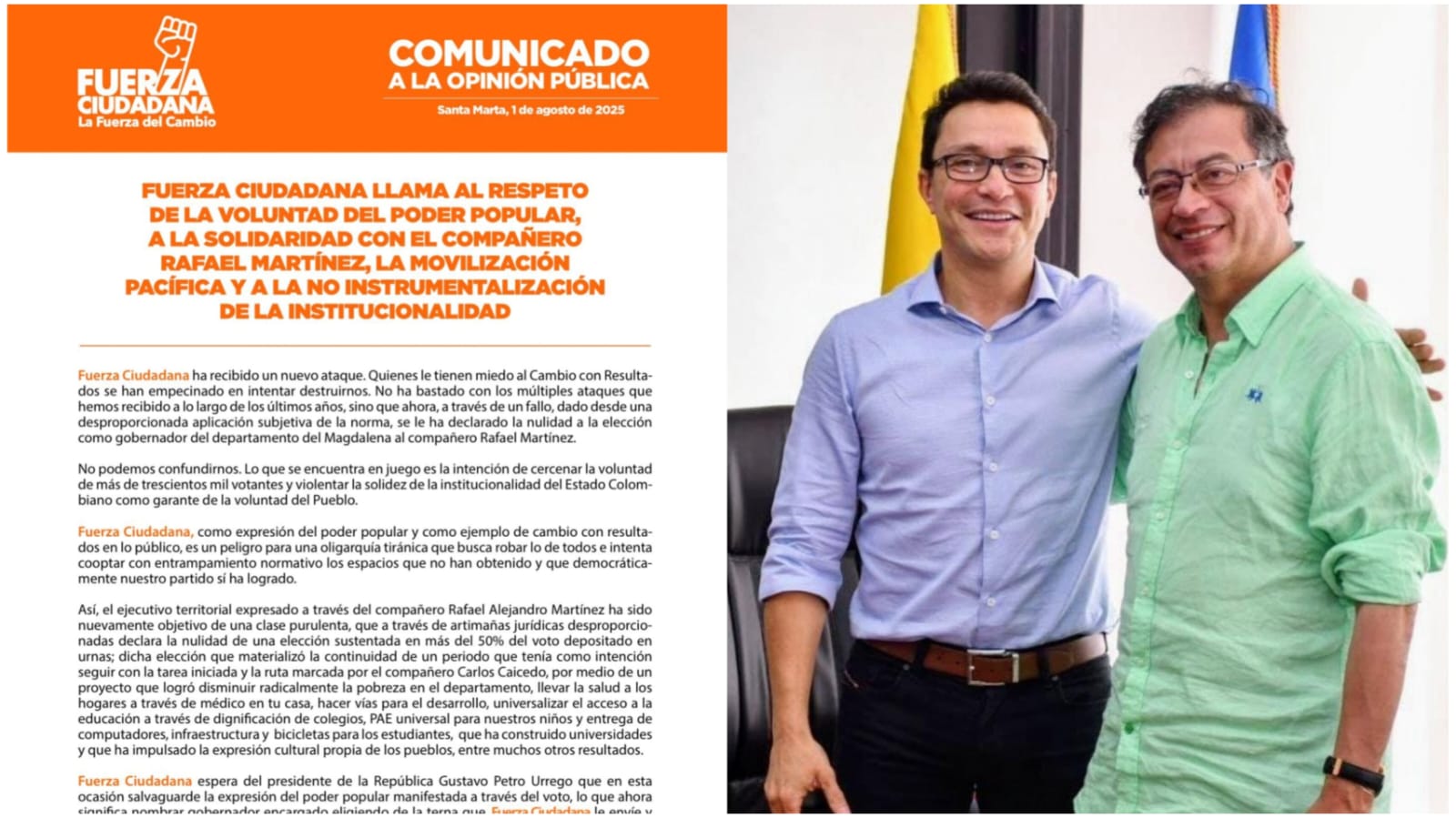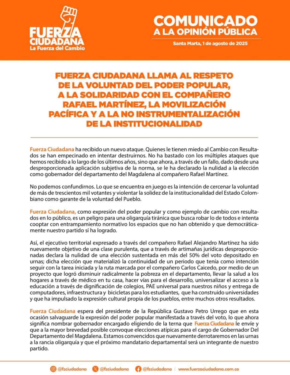 Fuerza Ciudadana espera del presidente de la República Gustavo Petro Urrego que en esta ocasión salvaguarde la expresión del poder popular manifestada a través del voto, lo que ahora significa nombrar gobernador encargado eligiendo de la terna que Fuerza Ciudadana le envíe y que a la mayor brevedad posible convoque elecciones atípicas para el cargo de Gobernador del Departamento del Magdalena. Estamos convencidos que nuevamente derrotaremos en las urnas a la rancia oligarquía y que el próximo mandatario departamental será un integrante de nuestro partido.