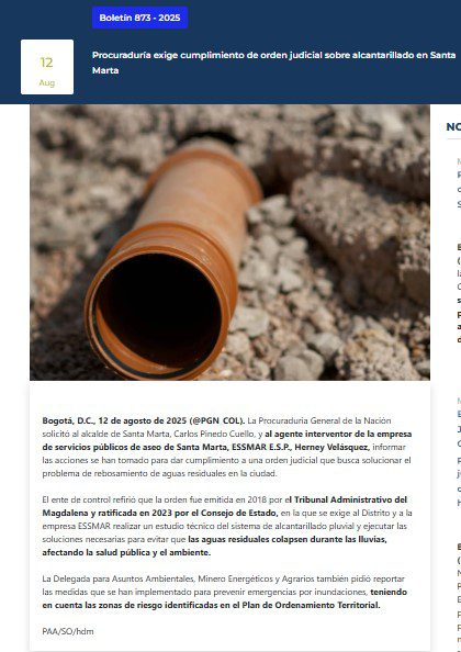 La Procuraduría General de la Nación solicitó al alcalde de Santa Marta, Carlos Pinedo Cuello, y al agente interventor de ESSMAR E.S.P., Herney Velásquez, informar qué acciones se han tomado para cumplir una sentencia judicial que ordena solucionar el rebosamiento de aguas residuales en la ciudad.