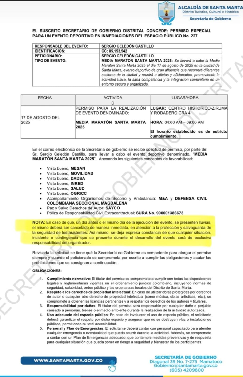 Sin embargo, ante la insistencia de los organizadores, se radicó una nueva solicitud que derivó en un permiso condicionado. Este establecía que, si llovía el día anterior o el mismo día de la maratón, el evento debía cancelarse para salvaguardar la integridad de los participantes y asistentes. Las lluvias se presentaron, y por tanto, la suspensión era obligatoria.