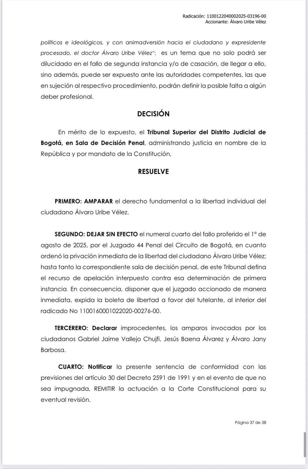 La decisión judicial ordena la expedición inmediata de la boleta de libertad mientras se resuelve el recurso de apelación. Además, se declaró improcedente la tutela presentada por terceros que no acreditaron afectación directa.