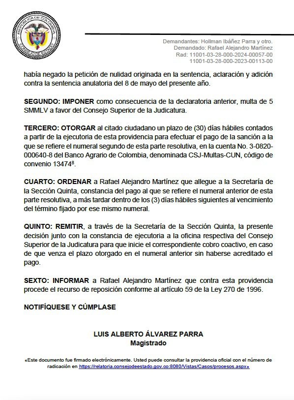 La decisión, con ponencia del magistrado Luis Alberto Álvarez Parra, declaró que Martínez incurrió en la conducta prevista en el artículo 295 del Código de Procedimiento Administrativo y de lo Contencioso Administrativo (CPACA), por lo cual el tribunal le impuso una multa equivalente a cinco salarios mínimos legales mensuales vigentes (SMMLV), a favor del Consejo Superior de la Judicatura, con un plazo de 30 días hábiles para efectuar el pago.