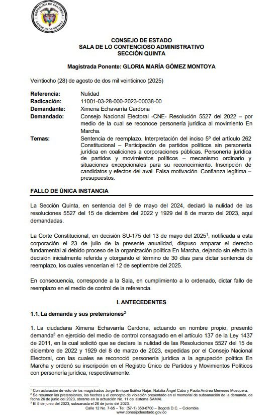 La Sección Quinta del Consejo de Estado, con ponencia de la magistrada Gloria María Gómez Montoya, profirió este jueves una sentencia de reemplazo en el proceso de nulidad que cuestionaba el reconocimiento de la personería jurídica del movimiento político En Marcha.