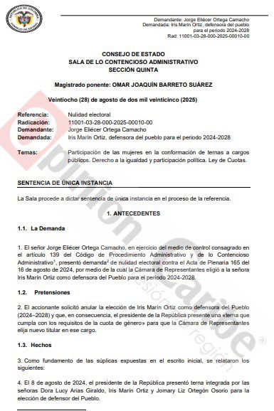 La Sección Quinta del Consejo de Estado negó la nulidad electoral solicitada contra la elección de Iris Marín Ortiz como Defensora del Pueblo para el periodo 2024–2028, ratificando la legalidad de su designación por parte de la Cámara de Representantes.