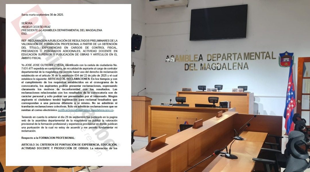 El proceso de selección para el cargo de Contralor Departamental del Magdalena enfrenta una nueva controversia luego de la publicación de los resultados de la terna de aspirantes. José José Gutiérrez Vega, uno de los candidatos, presentó una reclamación formal ante la Asamblea Departamental, señalando discrepancias significativas en la valoración de su formación profesional y experiencia.