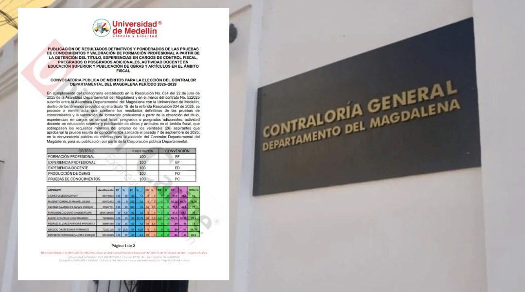La Universidad de Medellín publicó los resultados de la prueba escrita y la valoración de antecedentes de los 26 aspirantes que superaron el examen de conocimientos realizado el pasado 7 de septiembre de 2025, dentro de la convocatoria pública de méritos para la elección del Contralor Departamental del Magdalena, correspondiente al periodo 2026–2029.