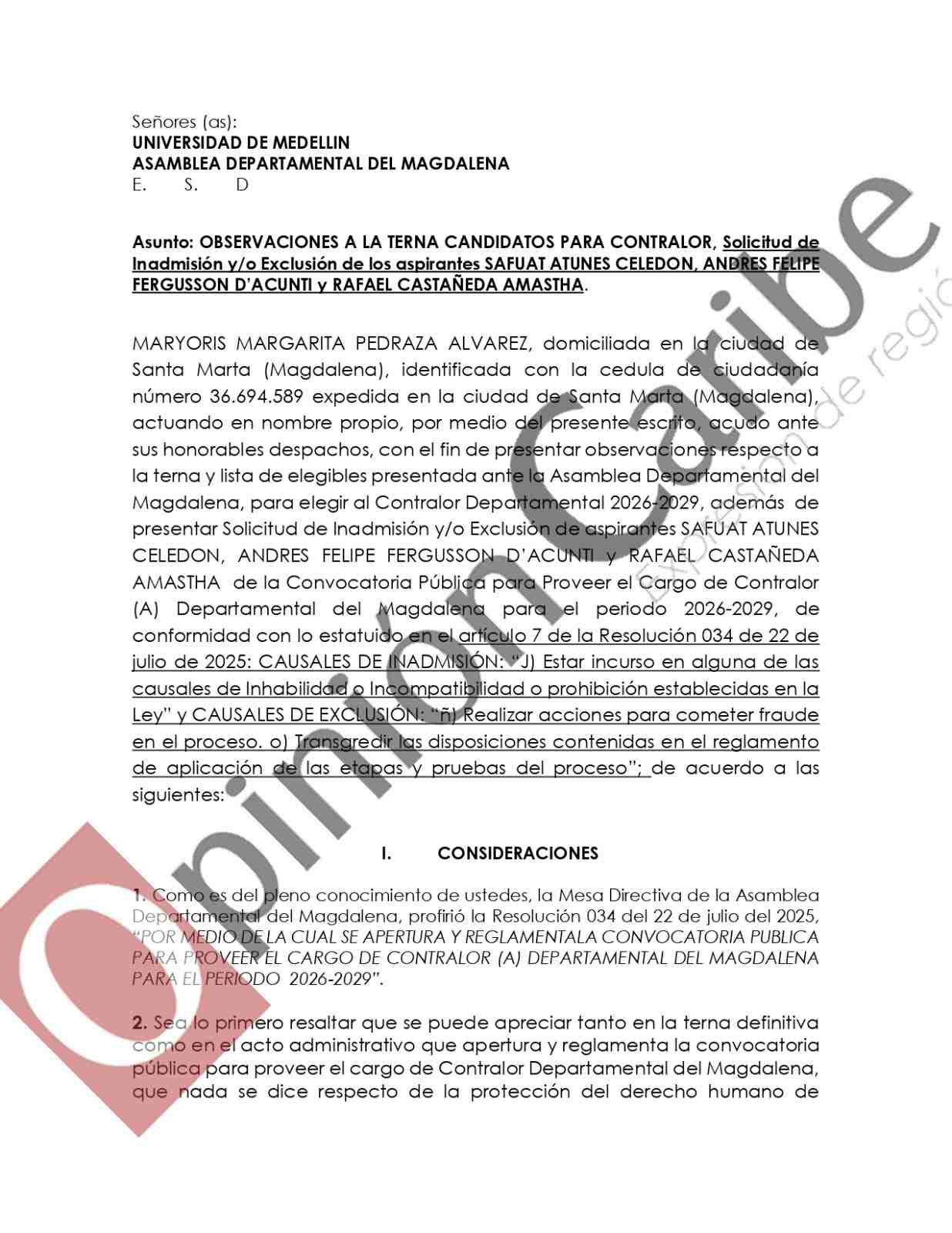 Pedraza Álvarez, quien participó en la convocatoria pública, presentó una “Petición y Observaciones” dirigida tanto a la Asamblea Departamental como a la Universidad de Medellín, con el objetivo de lograr la inadmisión o exclusión de los ternados Safuat Atunes Celedón, Andrés Felipe Fergusson D’Acunti y Rafael Castañeda Amastha. La aspirante alegó que la reglamentación de la convocatoria (Resolución 034 de 2025) no protegía adecuadamente el derecho a la equidad de género.