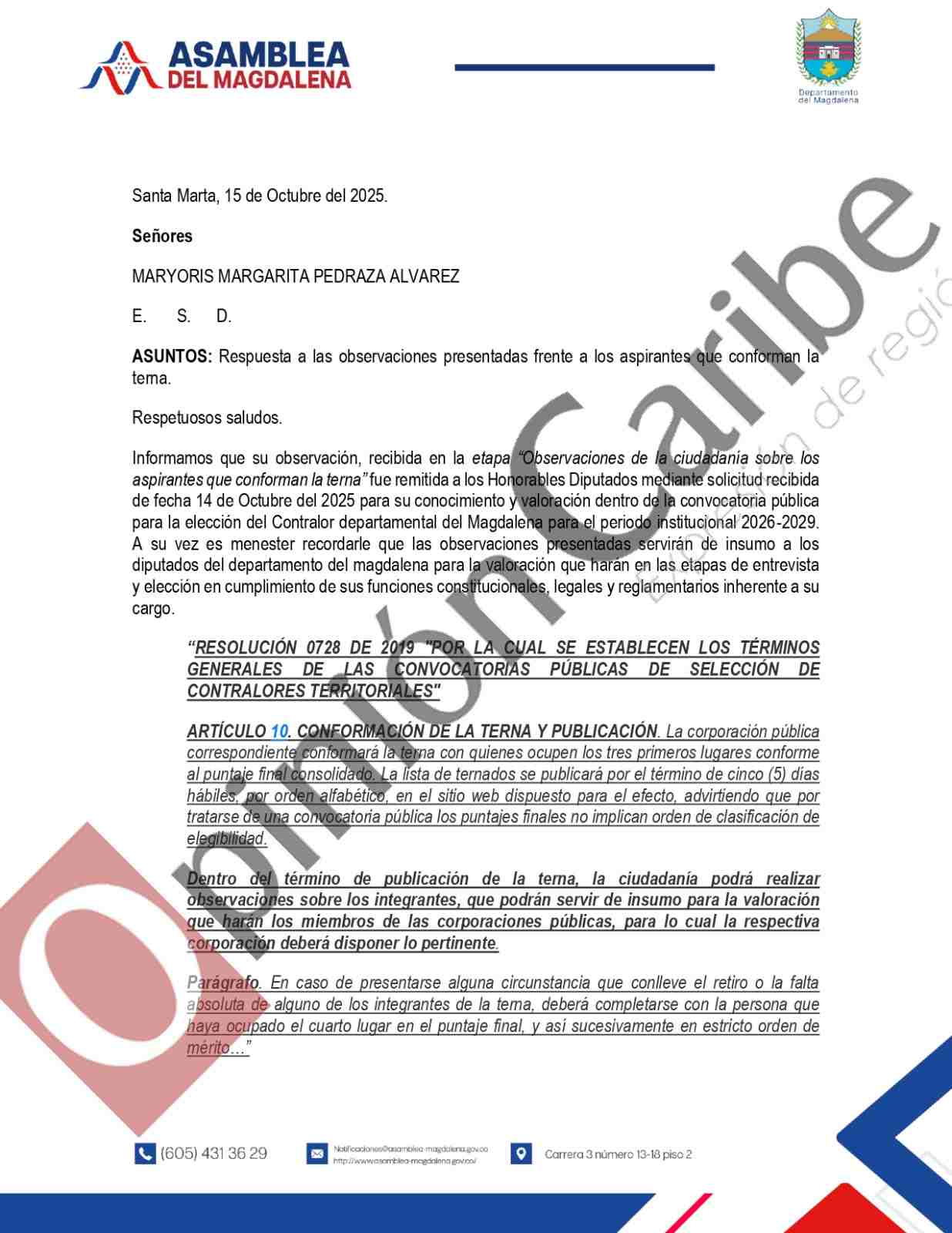La elección del Contralor Departamental del Magdalena para el periodo 2026-2029 continúa generando debate en la región, luego de que la Asamblea Departamental respondiera a las observaciones presentadas por la aspirante Maryoris Margarita Pedraza Álvarez, quien cuestionó la legalidad y equidad del proceso de selección.
