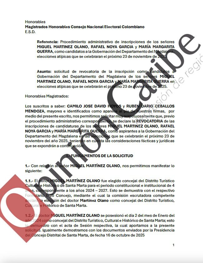 Una solicitud formal fue radicada ante el Consejo Nacional Electoral (CNE) de Colombia para que se revoquen las inscripciones de tres candidatos a la Gobernación del Magdalena en las elecciones atípicas del próximo 23 de noviembre de 2025.
