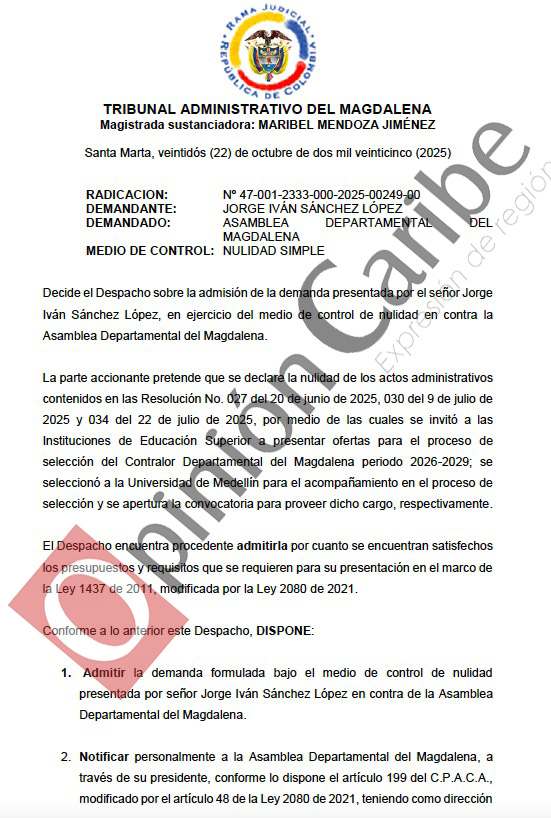 El Tribunal Administrativo del Magdalena admitió la demanda presentada por el ciudadano Jorge Iván Sánchez López contra la Asamblea Departamental del Magdalena, en ejercicio del medio de control de nulidad, al considerar cumplidos los requisitos exigidos por la ley.