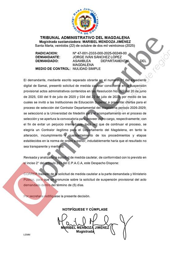 Con estas decisiones, el Tribunal inicia el estudio judicial de un proceso que podría incidir en la validez del procedimiento de elección del Contralor Departamental del Magdalena, actualmente en el centro del debate político y jurídico en la región.