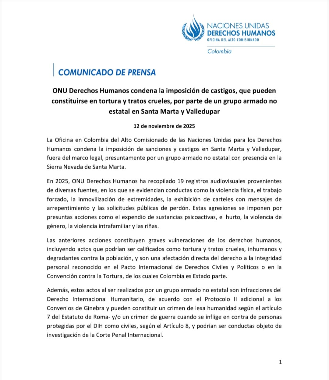 A través de un comunicado, la Oficina en Colombia del Alto Comisionado de las Naciones Unidas para los Derechos Humanos (ONU-DH) “condenó” la imposición de sanciones y castigos por parte de un grupo armado con presencia en la Sierra Nevada de Santa Marta, que habría actuado al margen de la ley en zonas de Santa Marta y Valledupar.