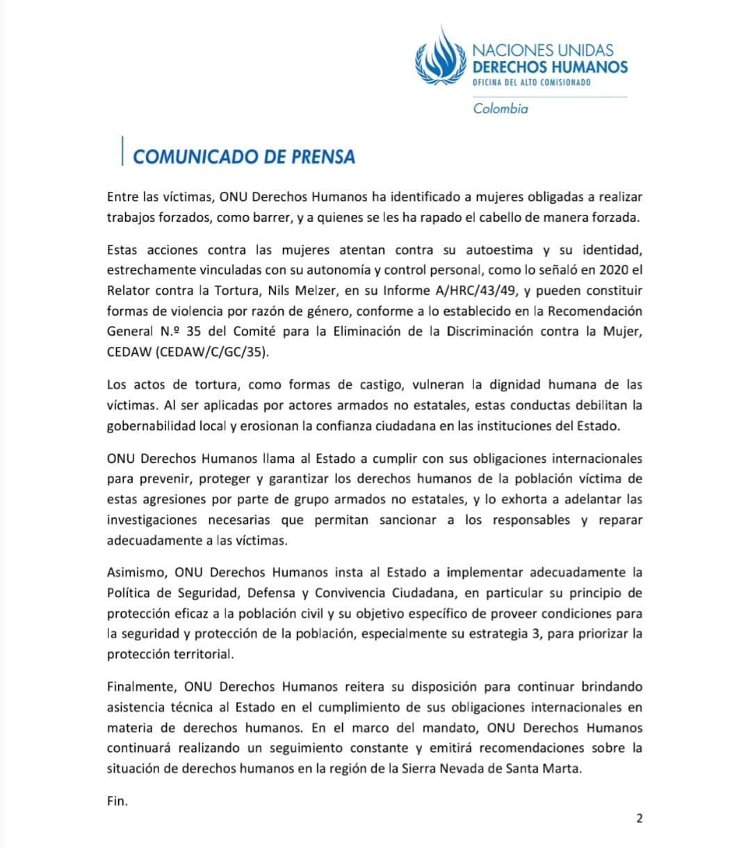 Finalmente, la ONU reiteró su disposición para brindar asistencia técnica al Estado colombiano y anunció que mantendrá un seguimiento constante a la situación de derechos humanos en la Sierra Nevada de Santa Marta y su zona de influencia.
