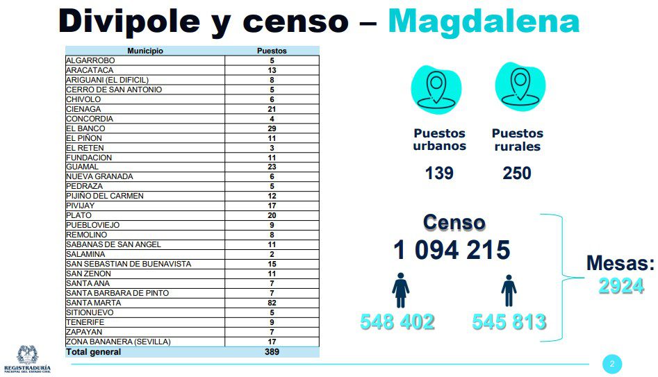 Santa Marta, como capital distrital, concentrará el mayor número de puestos con 82, seguida por El Banco con 29, Guamal con 23, Ciénaga con 21, y Plato con 20. Municipios como Zona Bananera (Sevilla) y Pivijay contarán con 17 puestos, mientras que otros como Salamina tendrán solo dos.