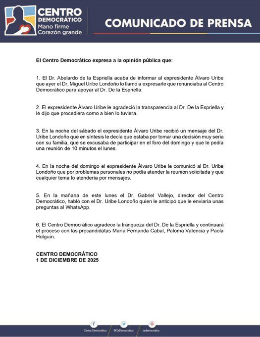 El Centro Democrático retiró a Miguel Uribe Londoño como precandidato presidencial, luego de que este, al parecer, manifestara la intención de apoyar a Abelardo De la Espriella. En un comunicado, partido informó que el propio expresidente Álvaro Uribe recibió una llamada de De la Espriella, quien le contó de las intenciones de Uribe Londoño.