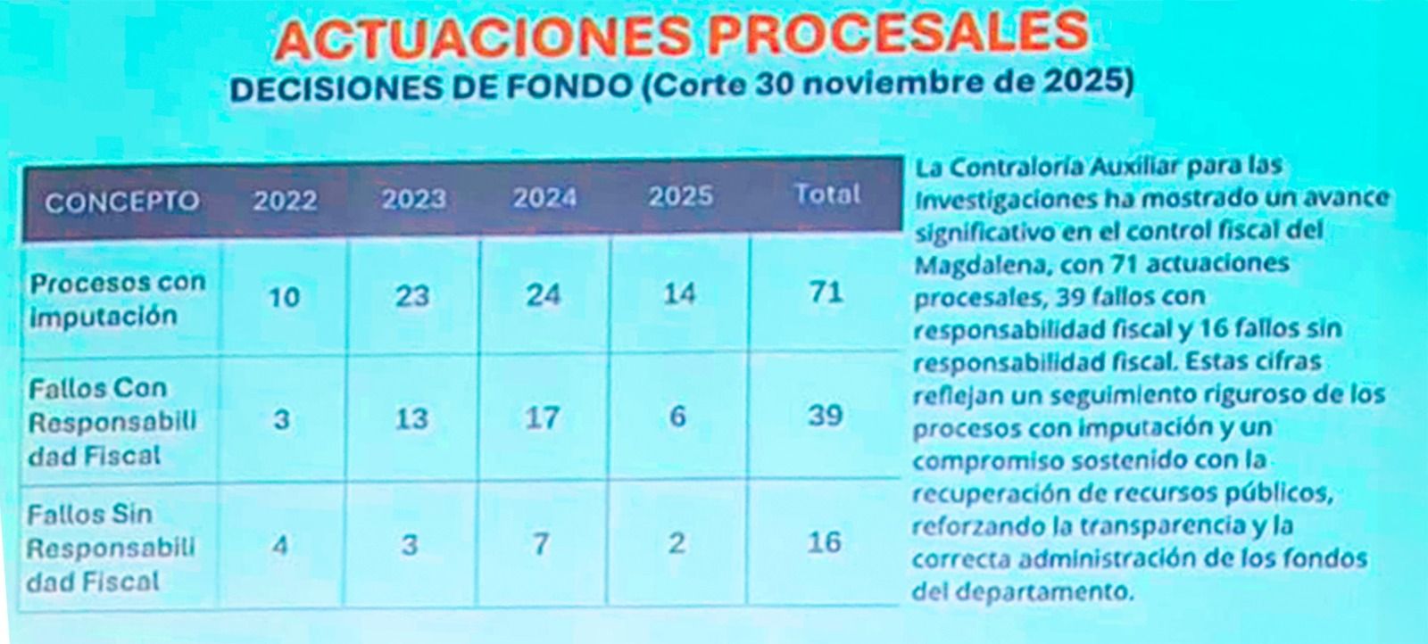 Más allá de la polémica, las cifras del cuatrienio evidencian un balance institucional pobre. La Contraloría abrió 160 procesos de responsabilidad fiscal derivados de 132 hallazgos, pero solo 71 avanzaron a imputación y apenas 39 terminaron en fallos condenatorios. En términos globales, su efectividad apenas llegó al 24,4% desde que se inicia cada proceso.