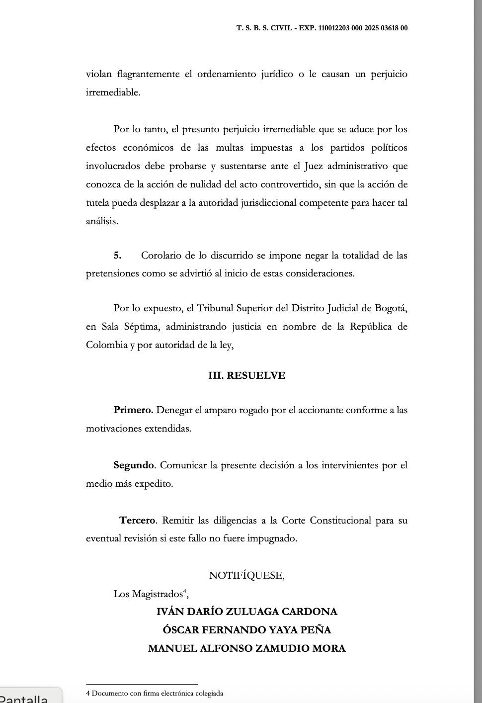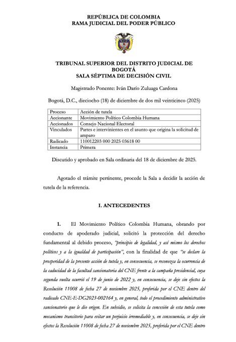 La Sala Séptima de Decisión Civil del Tribunal Superior del Distrito Judicial de Bogotá rechazó la acción de tutela interpuesta por el movimiento político Colombia Humana, que buscaba anular las sanciones impuestas por el Consejo Nacional Electoral por presuntas irregularidades en la financiación de la campaña presidencial de 2022.