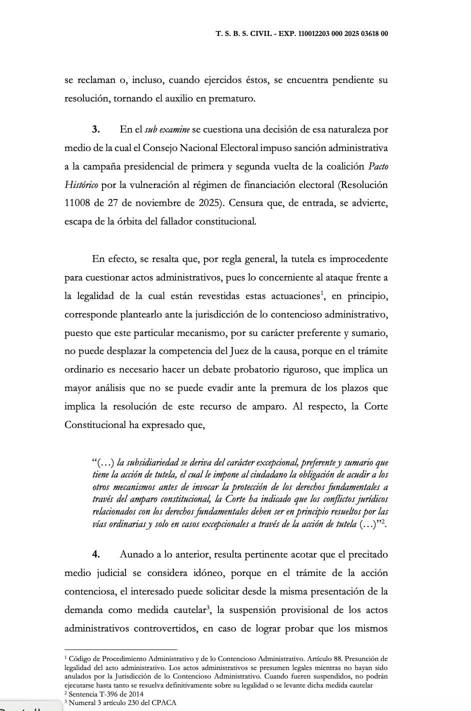 La tutela alegaba la vulneración de derechos fundamentales como el debido proceso, la igualdad de participación y el principio de legalidad, y solicitaba dejar sin efectos la Resolución 11008 del 27 de noviembre de 2025, mediante la cual el CNE sancionó a la coalición Pacto Histórico por incumplimientos en el régimen de financiación electoral durante la primera y segunda vuelta presidencial.