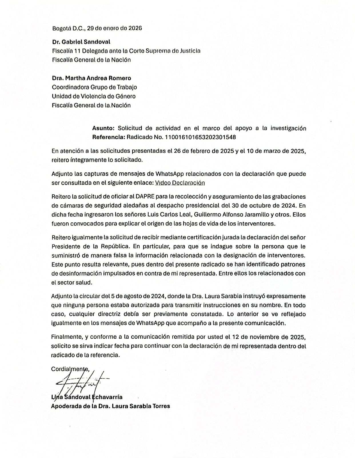 La petición quedó consignada en un escrito dirigido a la Fiscalía 11 Delegada ante la Corte Suprema de Justicia y a la Unidad de Violencia de Género, fechado el 29 de enero de 2026. En el documento, la apoderada de Sarabia, Lina Sandoval Echavarría, insiste en que se adelanten diligencias clave para esclarecer el origen de la información que involucró a su defendida en la supuesta designación irregular de interventores de EPS.