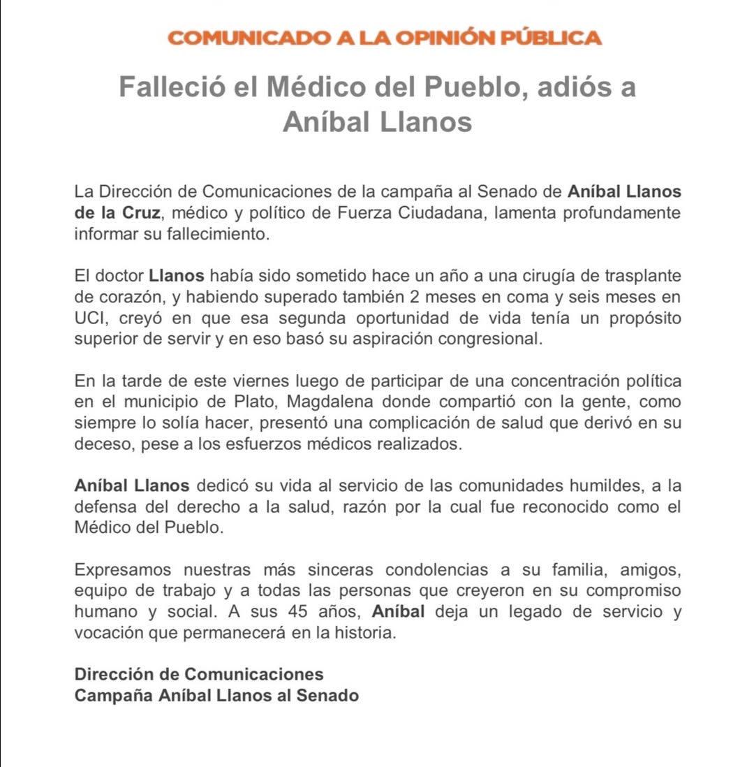 De acuerdo con el comunicado oficial, Llanos presentó una complicación de salud en la tarde de este viernes, después de compartir con la comunidad, situación que derivó en su deceso pese a los esfuerzos médicos realizados. El dirigente político era candidato al Senado de la República por la coalición Fuerza Ciudadana.