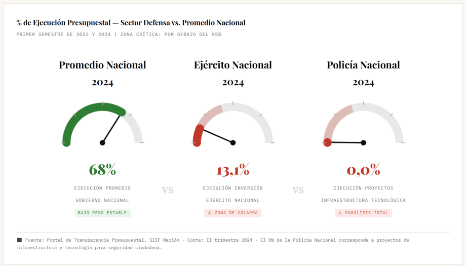 En papel, una suma imponente. En la realidad de las bases, una promesa que no se ejecuta. El dato que cambia todo es este: al cierre del segundo trimestre de 2025, el sector defensa había ejecutado financieramente apenas el 19,2% de sus recursos de inversión. El Ejército Nacional, con un avance del 13,1%. La Policía Nacional, con unos cero absolutos en proyectos de infraestructura y tecnología.