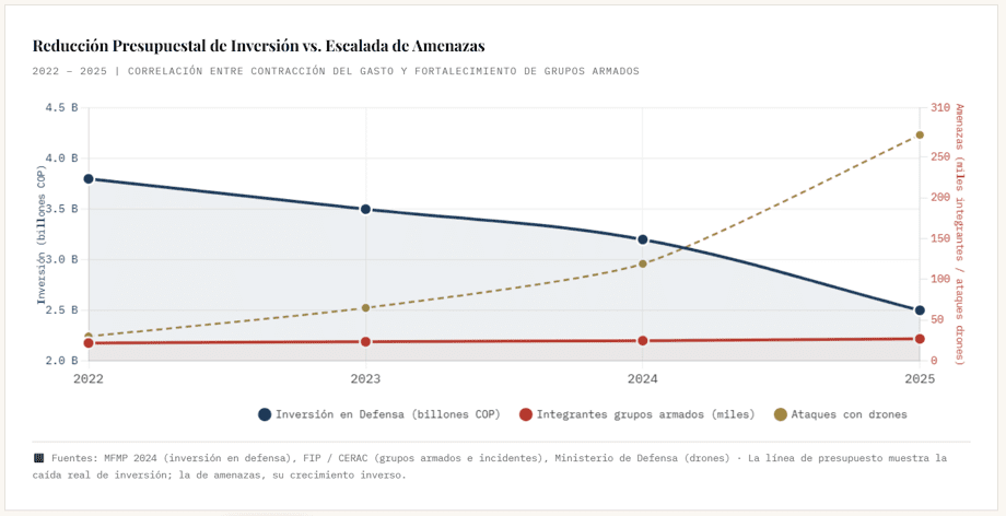 No es error de transcripción. Es el estado real de una institución que tiene dinero asignado en planillas y no tiene cómo convertirlo en operatividad. La trampa está en la estructura del gasto. El 79% —algunos análisis técnicos elevan esa cifra hasta el 95% si se incluyen todas las obligaciones prestacionales— se va en nómina, pensiones y asignaciones de retiro. Lo que sobra para modernización, mantenimiento y dotación táctica no llega siquiera a los niveles de décadas anteriores en términos reales. El presupuesto de inversión cayó de 3,2 billones de pesos en 2024 a una proyección de 2,5 billones para 2025: una reducción del 23% que nadie llama por su nombre.
