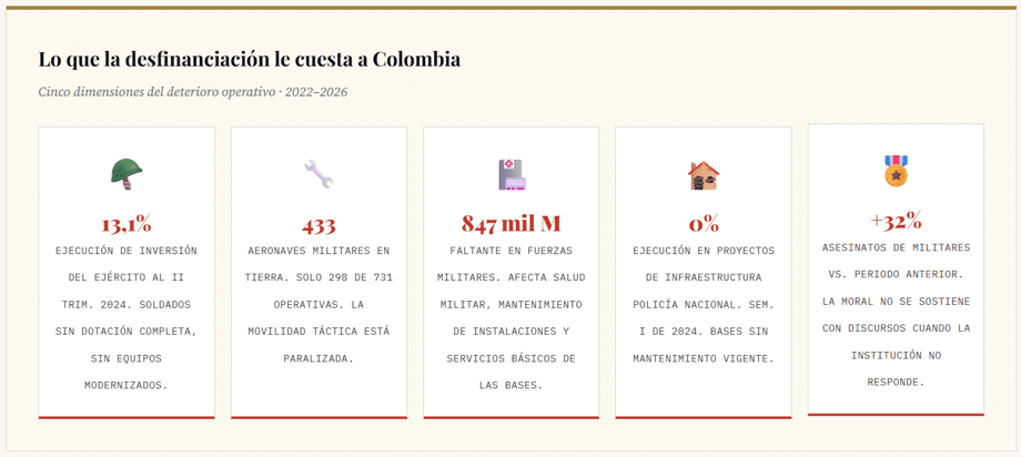El Decreto 0766 de junio de 2024 congeló fondos clave para operaciones en zonas de alto riesgo como el Catatumbo —precisamente el territorio donde meses después estallaría la peor crisis humanitaria del año—. Las Fuerzas Militares asumieron gastos imprevistos como vuelos de repatriación desde Estados Unidos que superaron los 40.000 millones de pesos, sin reembolso del Ministerio de Hacienda. El Estado le debe al Ejército.