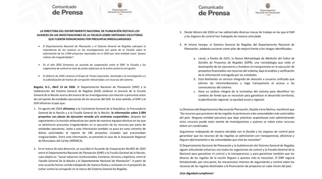 El caso no es aislado. Según datos del DNP, en 2024 se registraron 2.094 proyectos con plazos vencidos o suspendidos y 146 con irregularidades detectadas en campo dentro del sistema de regalías. A esto se suma que organizaciones como Transparencia por Colombia han advertido que una proporción significativa de contratos bajo estos esquemas presenta problemas de trazabilidad o niveles de opacidad en plataformas como SECOP.