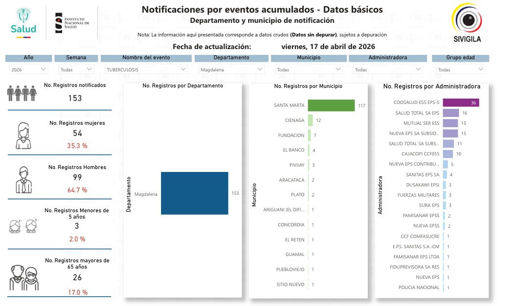 Un total de 153 casos de tuberculosis han sido reportados en el departamento del Magdalena en lo corrido de 2026, de acuerdo con un informe reciente del Instituto Nacional de Salud (INS), a través del sistema de vigilancia epidemiológica SIVIGILA.