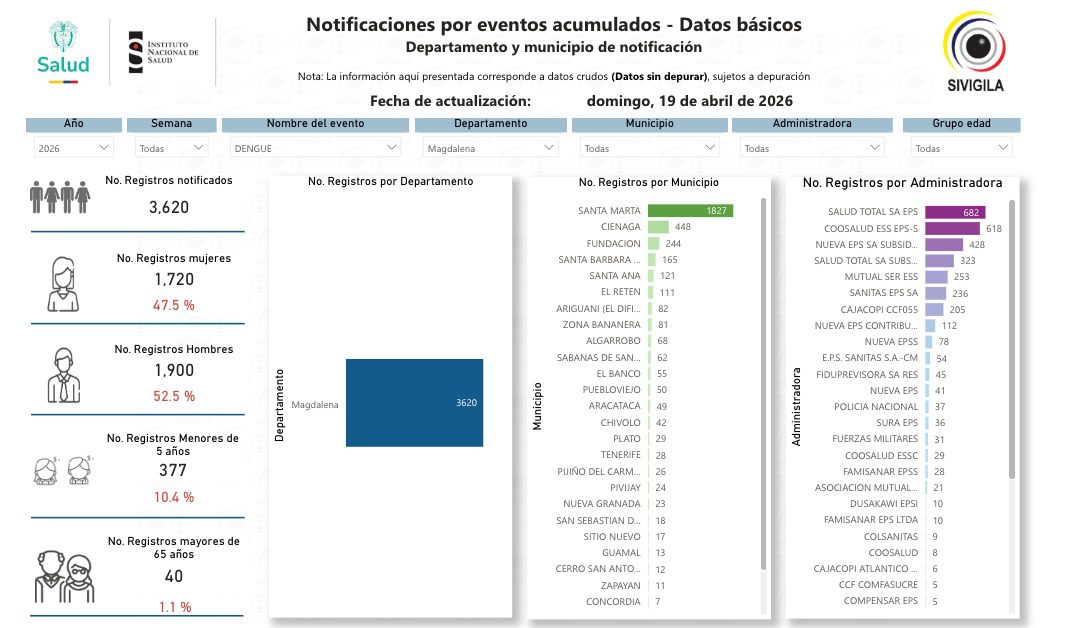 El departamento del Magdalena acumula 3.620 casos de dengue en lo corrido de 2026, según el más reciente reporte del Instituto Nacional de Salud (INS) a través del sistema de vigilancia epidemiológica SIVIGILA. Las cifras ubican a Santa Marta como el principal foco de propagación, con 1.827 casos, lo que representa más del 50 % del total departamental.