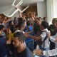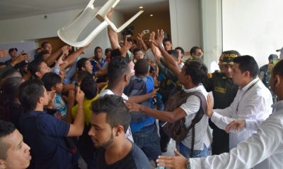 Alumnos de la Universidad del Atlántico, protestan a las afueras del Centro de Convenciones en esta universidad exigiendo que el Esmad se retirara del lugar porque en...